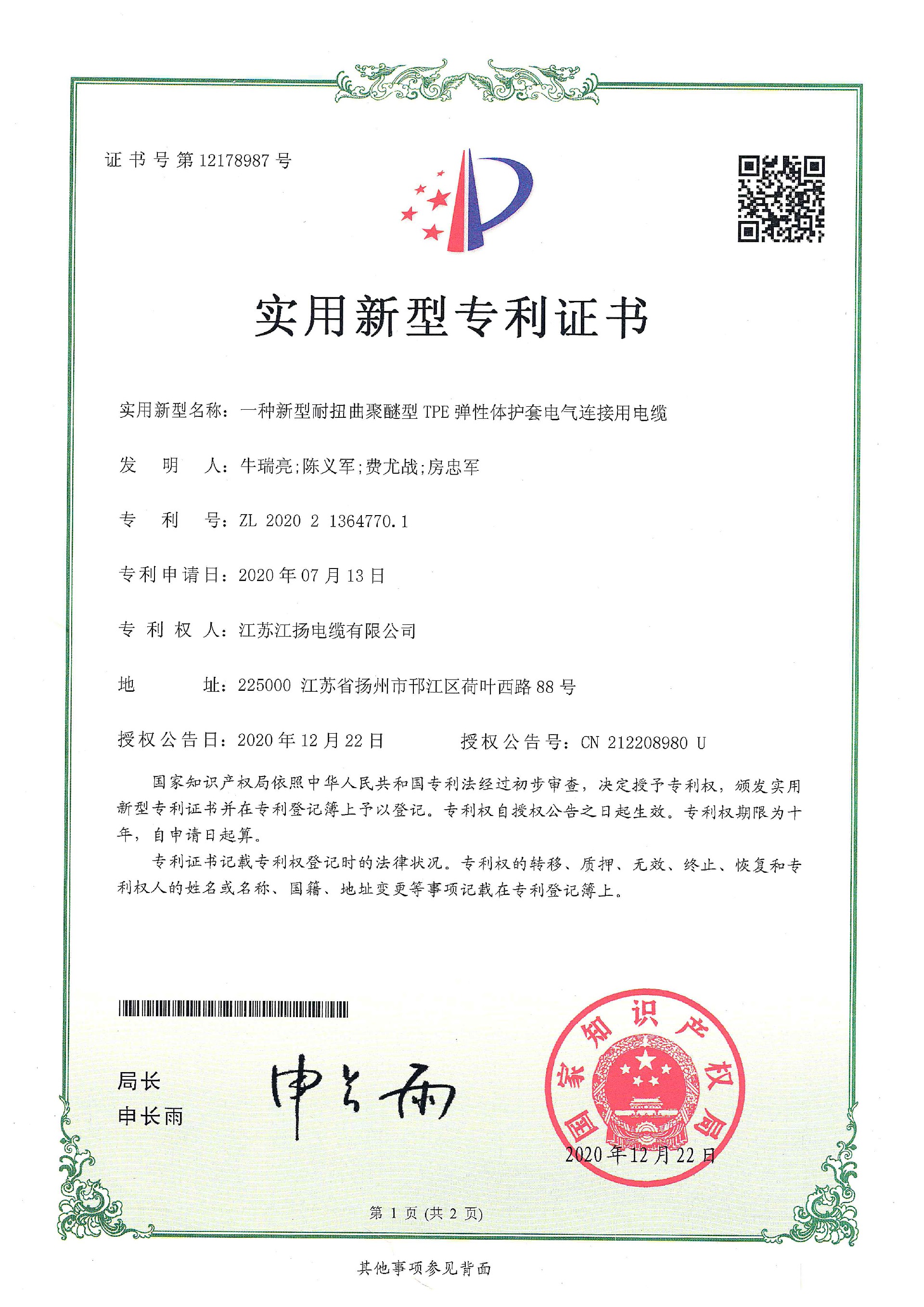 一种新型耐扭曲聚醚型TPE弹性体护套电气连接用电缆