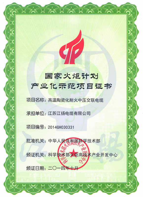 国家火炬计划产业化示范项目证书