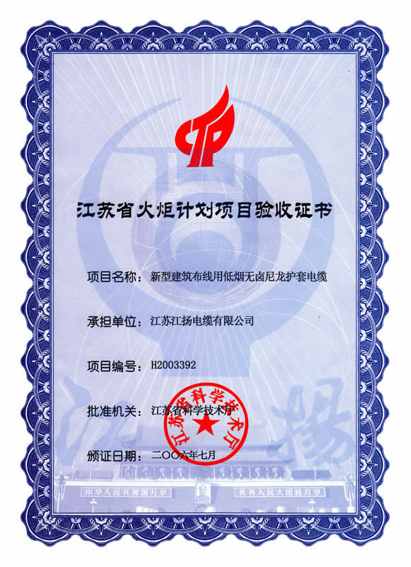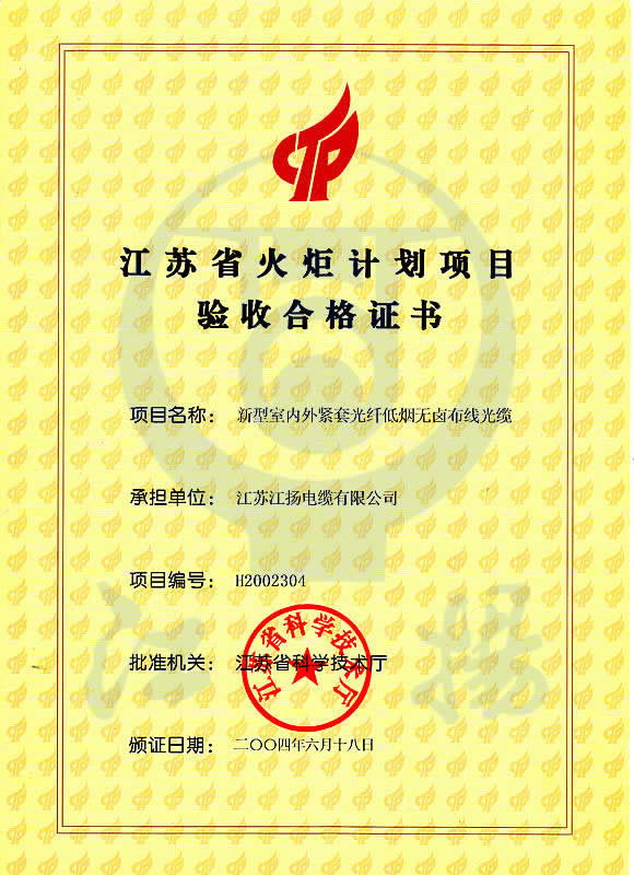 江苏省火炬计划项目验收证书
